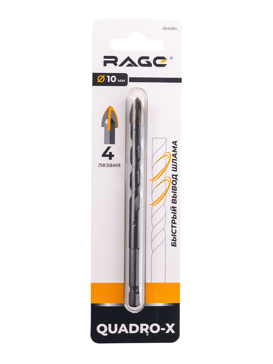 Сверло по стеклу/керамике 10,0мм (1шт) Quadro-X спиральное HEX 4 грани арт.554084 RAGE *1/10
