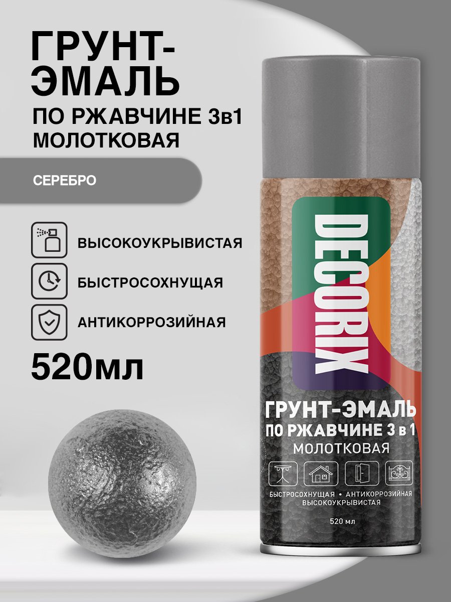 Грунт-аэрозоль по ржавчине 3 в 1 серебро молотковая 520/200 мл DECORIX *1/12