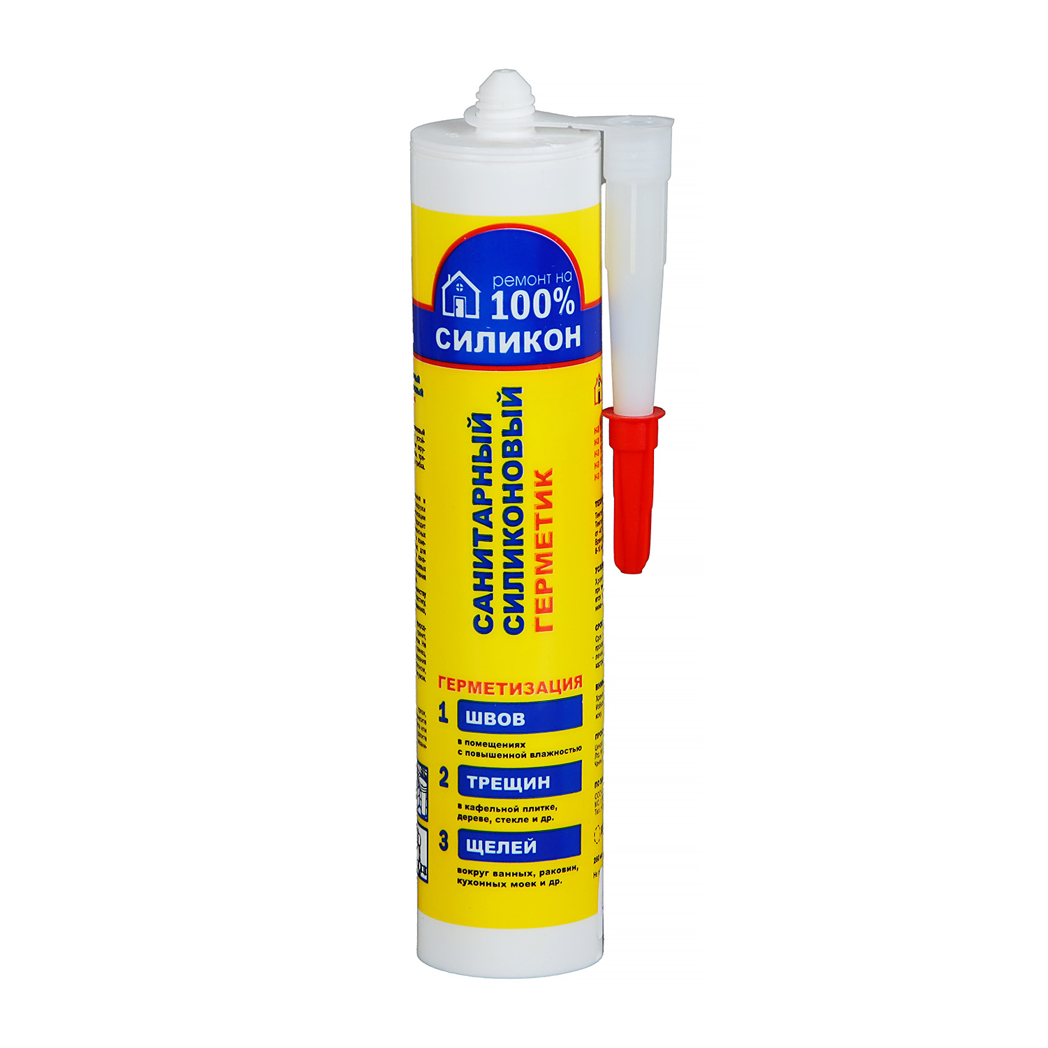Санитарный силиконовый герметик «Ремонт на 100%» прозрачный предназначен для герметизации подвижных швов, трещин и щелей снаружи и внутри помещений (санитарных, с повышенной влажностью).