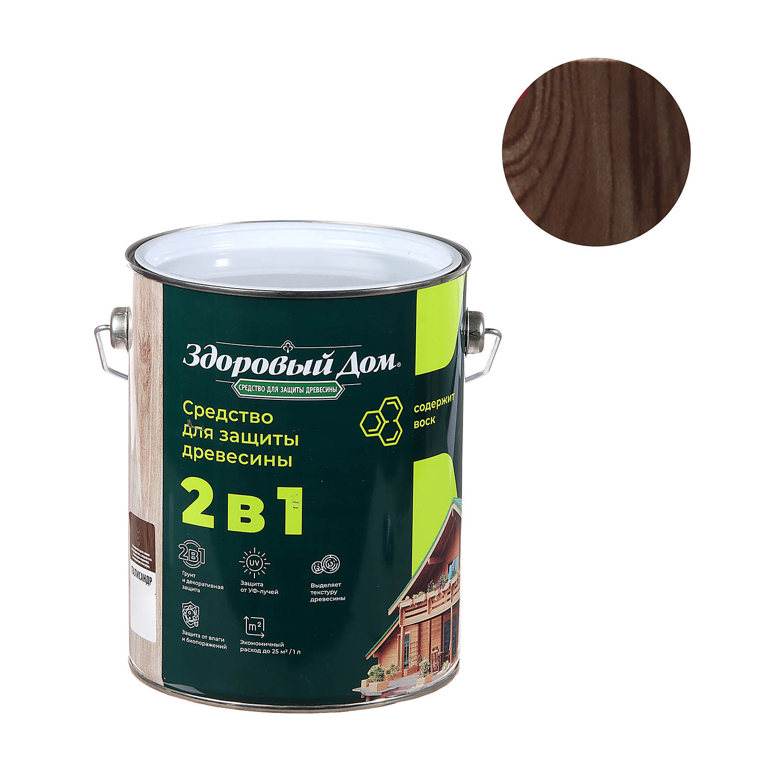 Деревозащитное средство Здоровый дом 2 в 1 палисандр 2.7 л представляет собой высокоэффективное покрытие для декоративной отделки древесины и защиты поверхностей на срок до 8 лет. Формула 2 в 1 позволяет наносить состав без предварительного использования грунта.