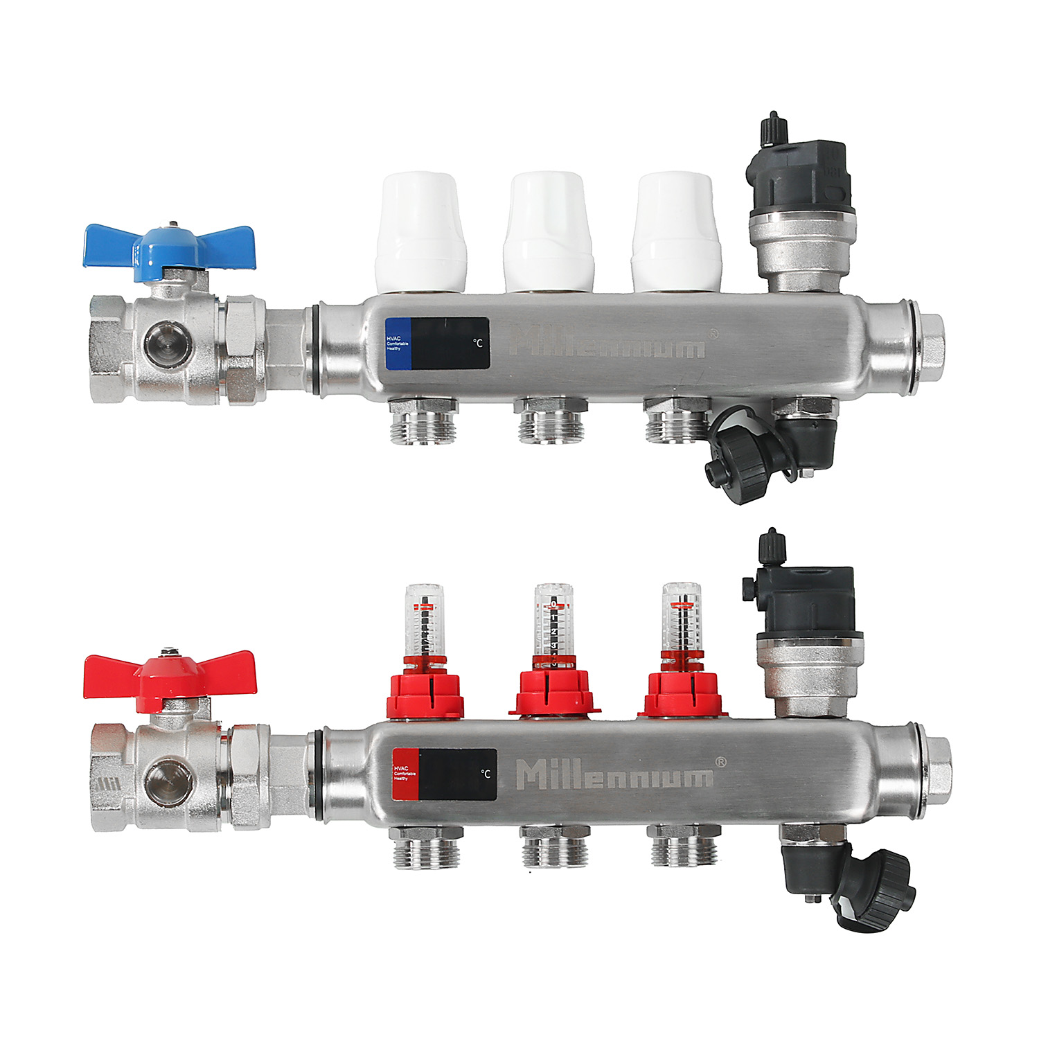 Коллекторная группа Millennium с расходомерами выполнена из нержавеющей стали, имеет регулировочные и термостатические вентили. Применяется при монтаже радиаторного отопления и теплых полов.
