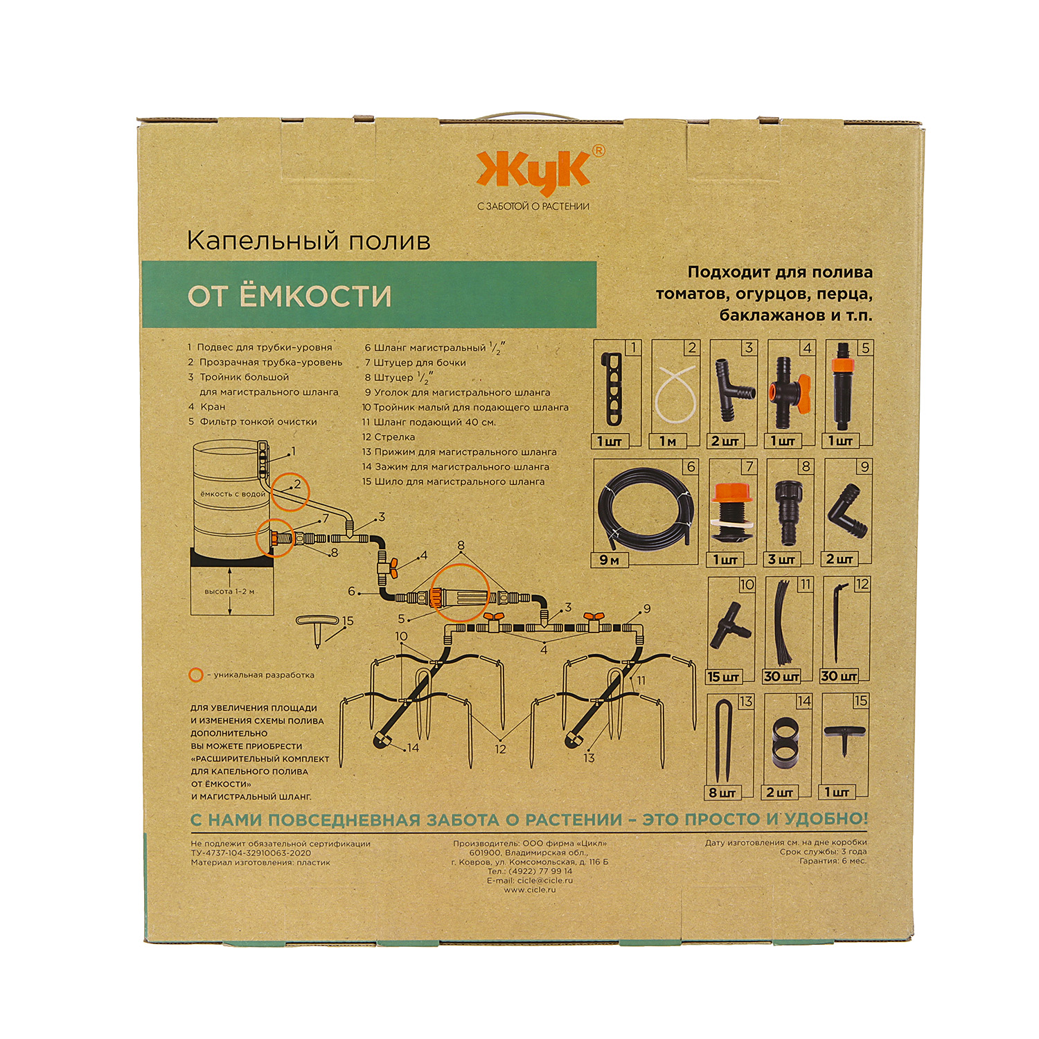 Прикорневой капельный полив Жук от емкости полностью готов к работе. Используется в парниках и теплицах, а также на открытом грунте.