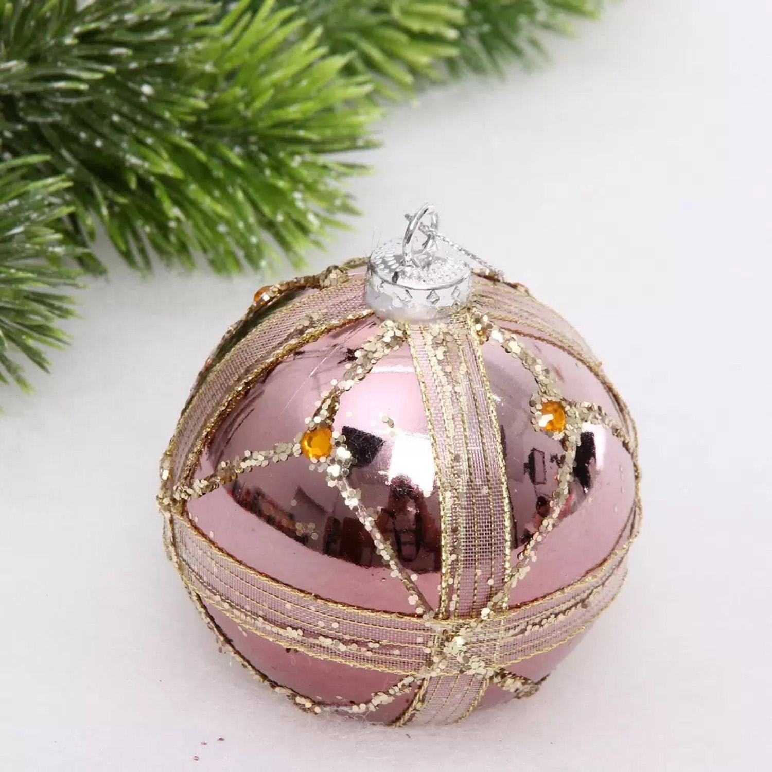 Новогодний шар "Изящные полосы" 8 см, Розовое золото