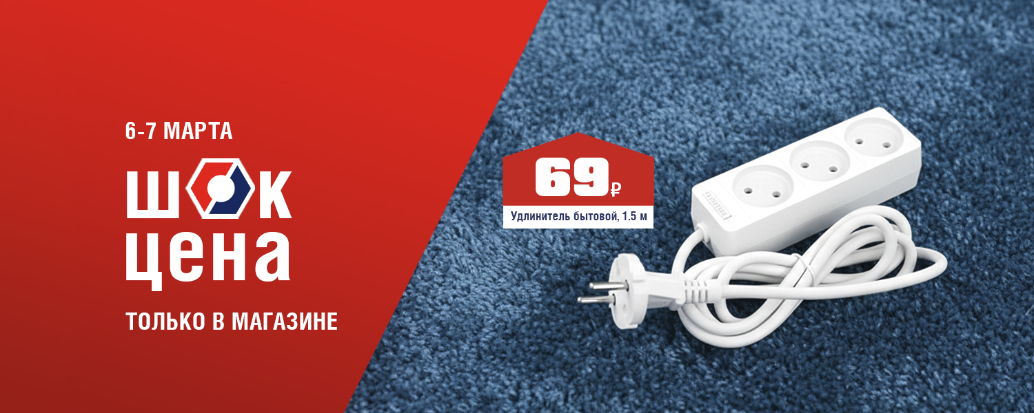 Устали искать свободную розетку? Удлинитель с тремя гнездами подарит свободу вашей технике. Компактный, надежный, выдерживает нагрузку до 2.2 кВт. Подключайте мощные приборы без страха за проводку. 6 и 7 марта в розничных магазинах ДомоСтрой не пропустите ШОК-цену: