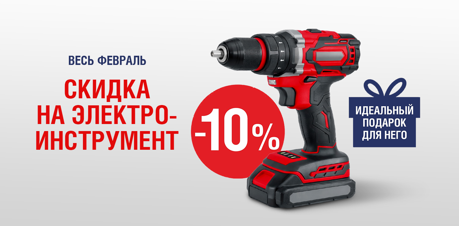 Пора выбирать подарки к 23 февраля — и делать это выгодно! Весь февраль — скидка -10% на электроинструмент. Самое время порадовать близких полезным и практичным подарком. Электроинструмент — отличный вариант для тех, кто любит мастерить, заниматься ремонтом или просто ценит хорошие вещи для дома и дачи.